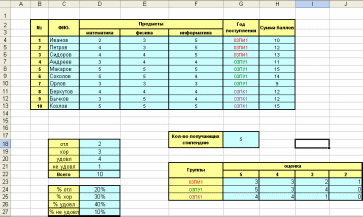 Согласно созданному заголовку в таблицу были введены: количество отличников, количество учащихся на "хорошо", количество учащихся на "удовлетворительно", количество учащихся получающих стипендию, процентное соотношение "отл", "хор", "удовл". Общий вид таблицы приводится в приложении Б.