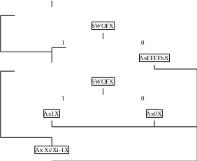 На рисунке 7 приведен фрагмент алгоритма вычисления функции и формирования результата. При этом следует обратить внимание на некоторые особенности алгоритма. Входные значения находятся регистрах Ax=Xi и Bx=Xi-1. Результат формируется в регистре Ax. Т.к. слово состояния представляет собой набор бит, то операция типа SWdiv0 представляет собой установка соответствующего бита. Более того, наличие исключительных ситуаций предполагает наличия двух значений для каждого операнда: само значение и его представление в слове состояния (см. рисунок 6), причем, изменение одного из них не влечет изменения другого.