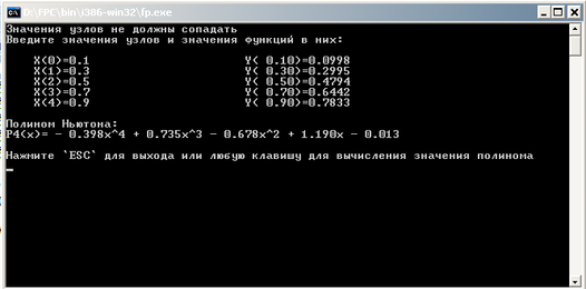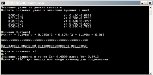 Writeln('Построение интерполяционного полинома Ньютона по значениям функции в узлах');
