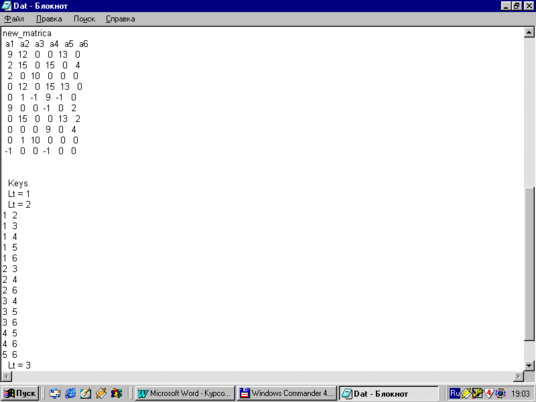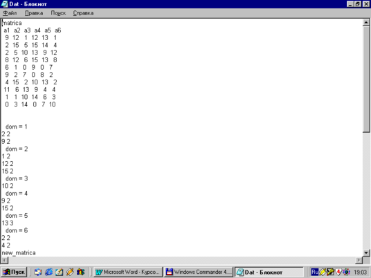 for (i=0; i for (j=0; j { a[i] [j]=rand()%(n+m); if (a[i] [j]<0) a[i] [j]=0; } } void vivod_1 () { FILE *f; int i, j; f=fopen («dat.txt», «a+»); fprintf (f, «matrica\n»); for (i=1; i<=m; i++) fprintf (f,» a % 1d», i); fprintf (f, "\n»); for (i=0; i { for (j=0; j fprintf (f, «%3d», a[i] [j]); fprintf (f, "\n»); } fprintf (f, "\n»); fclose(f); } void vivod_2 () { FILE *f; int i, j; f=fopen («dat.txt», «a+»); fprintf (f, «new_matrica\n»); for (i=1; i<=m; i++) fprintf (f,» a % 1d», dn[i] [1]); fprintf (f, "\n»); for (i=0; i { for (j=0; j if (b[i] [j]>0) fprintf (f, «%3d», d [b[i] [j]+dn [j-1] [2]] [1]); else fprintf (f, «%3d», b[i] [j]); fprintf (f, "\n»); } fprintf (f, "\n»); fclose(f); } // – // void create_domain() { FILE *f; unsigned short i, j, ii, jj, num; unsigned short dt [n-1] [1]; f=fopen («dat.txt», «a+»); dn[0] [2]=0;