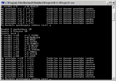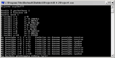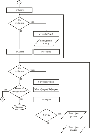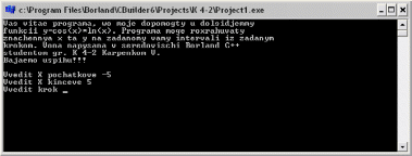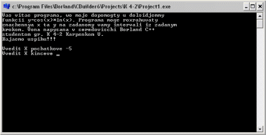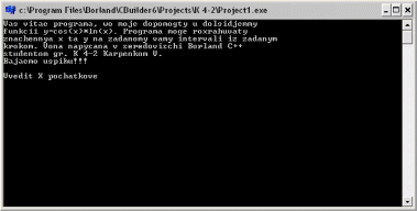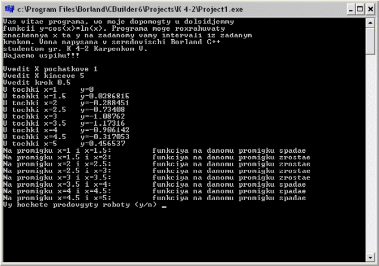 Блоки «Y1=cos(i)*ln(i)» «Y2=cos(і+крок)*ln(і+крок)» дозволяють обчислити на кожному з проміжків функції значення у та порівнявши їх (блок «у1  Блок «Бажаєте продовжити» фактично дозволяє користувачеві не виходячи з середовища програми знову скористатися її функціями ввівши дані заново. В випадку, коли користувач відповів «у », програма повертається до блоку «Запит ввести х початкове», в випадку, коли відповідь інша – програма закривається.  1.3 Одержання результатів роботи програми  Після запуску програми перед нами з’являється вікно з привітанням і пропозицією ввести х початкове:    Рисунок 1.3.1 – Вікно привітання, запит х початкового.  Після вводу значення х початкового нам буде запропоновано ввести х кінцеве:    Рисунок 1.3.2 – Вікно з пропозицією ввести х кінцеве.  Після введення х кінцевого нам буде запропоновано ввести крок:    Рисунок 1.3.3 – Вікно пропозицією ввести крок.  В випадку, якщо дані введено вірно, ми отримаємо вікно з результатом, і запит про продовження роботи, при погодженні з яким ми повертаємося на початок програми, якщо дані введено невірно, то програма видасть повідомлення про помилку та пропозицію ввести дані заново.    Рисунок 1.3.4 – Вікно з результатами та пропозицією продовжити роботу    Рисунок 1.3.5 – Вікно, що відображає повідомлення про помилково введені дані після отримання згоди про продовження роботи у програмі  При написанні програми на мові С++ використовуються такі поняття:  алфавіт,  константи,  ідентифікатори,  ключеві слова,  коментарі.  Алфавітом називається сукупність символів, які використовуються в мові. В мові С++ розрізняють прописні і строкові літери, тому що вона чутлива до реєстру.  В іменах змінних дозволено використовувати символ підкреслення.  Ідентифікатор використовується для позначення імен змінних, функцій і міток, які використовуються в програмі. Ідентифікаторам може бути будь – яка кількість латинських букв, цифр символів підкреслення. В мові С++ деякі ідентифікатори використовуються як службові слова (ключеві слова), які мають спеціальне значення для компілятора, вони не можуть використовуватися для іншого. Приклад службових слів: break, for, if, goto, sizeof, do, return і. т. д.  Константою називається значення змінної, яке є з самого початку програми визначеним. Далі в тексті програми використовується тільки ідентифікатор константи.  Коментар – це частина програми, яка ігнорується компілятором і слугує для зручності читання початкового тексту програми. В процесі компіляції коментар замінюється пробілом, тому коментар можна розташовувати в будь – якому місці програми, де дозволяється використовувати пробіли. Коментарем є будь – яка послідовність символів, яка знаходиться між парою символів /* та */. Символи, які розташовані за символами // і до кінця рядка також вважаються коментарем.  Принцип програмування на мові С++ заснований на понятті функції. Функція – це самостійна одиниця програми, яка створена для вирішення конкретної задачі. Кожна функція має ім’я і список аргументі.  Аргументи функції – це величини, які передаються їй під час виклику. Також при виклику функції тип фактичного параметру (він передається) повинен співпадати з типом формального параметру. Тіло функції заключається в операторні дужки {}. Кожна функція повинна повертати визначений тип результату. Повернення результату у викликаю