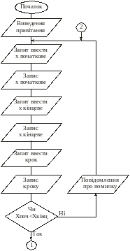 Блок «Чи Хпоч<Хкінц» означає, що в даному місці програма перевірить, чи х початкове менше, ніж х кінцеве. В випадку, якщо х початкове дійсно менше ніж х кінцеве, програма буде виконуватись далі, в іншому випадку буде виведено повідомлення про помилку (блок «Повідомлення про помилку»), та запропоновано ввести дані повторно.