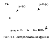 Інтерполяція – це наближена заміна функції f на відрізку [а; b] однією з функцій Р(х) цього класу так, щоб функція P(х) в точках x0,x1, ..., xn набувала тих самих значень, що й функція f, тобто щоб Р(xi)= уi (і = 0, 1, ..., n). На Рис.1.1.1 зображена інтерполяція функції.