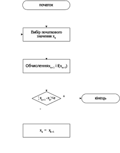 де хn+1 – значення х на наступній ітерації, а хn – значення х на попередній ітерації. Ця операція повторюється до тих пір, поки не виконається умова