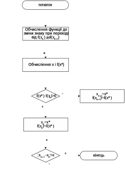 Після цього визначають f(xn+1) і порівнюють його з f(xn). Надалі користуються xn+1 замість того значення, з яким воно збіглося за знаком. Якщо | xn+1 – xn| < , то вся процедура повторюється спочатку.
