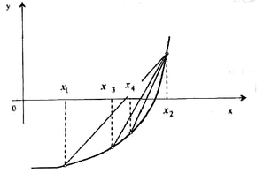 Цей метод полягає в тому, що визначаються значення функції в точках, що розташовані на осі через рівні інтервали. Це робиться поки кінці інтервалів xn+1 , хn не будуть мати різні знаки. Пряма, що проведена через ці дві точки, перетинає вісь у точці