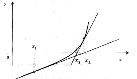 < Δ, де дельта певна задана похибка. Швидкість збіжності цього алгоритму значною мірою залежить від вірного вибору початкової точки. Коли в процесі обчислень кут нахилу дотичної f’(x)перетворюється на нуль, застосування цього методу ускладнюється. Можна також показати, що у випадку дуже великих значень f ’’(x) чи кратних коренів метод Ньютона стає неефективним.