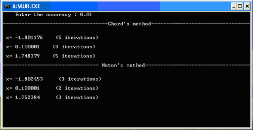 Програма, написана для вирішення поставленої задачі, містить кілька підпрограм. Спочатку програма пропонує ввести похибку, після чого виконує розвязок рівняння заданими методами. Для розвязку рівняння методом хорд використовується функція chords, що приймає в якості параметрів верхній хв та нижній ха проміжки х та кількість ітерацій iter. . Для розвязку рівняння методом Ньютона використовується функція Nuton з параметрами значень х на наступному та попередньому кроках: х , хlast та кількість ітерацій iter.
