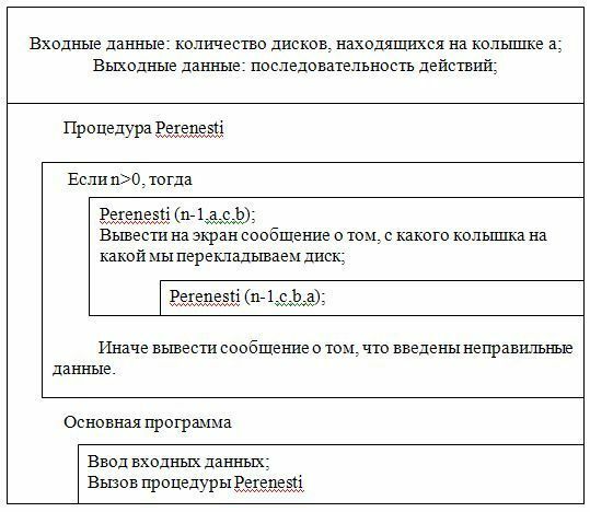 Для того, чтобы переложить всю пирамиду из дисков, надо сначала переложить все, что выше самого большого диска, с первого на вспомогательный колышек, потом переложить этот самый большой диск с первого на третий колышек, а потом переложить оставшуюся пирамиду со второго на третий колышек, пользуясь первым колышком как вспомогательным.
