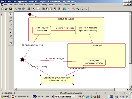 Далі ми реалізували діаграму станів (Statechart diagram), яка зображена на малюнку 5. Діаграма станів (Statechart) призначена для відображення станів об‘єктів системи, що мають складну модель поведінки.