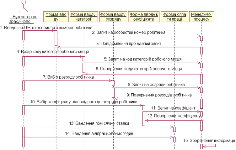 Діаграма послідовності – служить для моделювання характеристик взаємодії передачі і прийому повідомлень між об'єктами ІС;