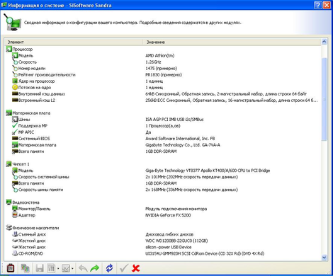 После инсталляции на Рабочем столе и в Контрольной панели появляется ярлык к SiSoft Sandra 2007. Двойной щелчок мышью по этому значку вызывает оболочку пакета, представляющую собой окно с пиктограммами входящих в него утилит. Существует четыре режима отображения пиктограмм: информационные утилиты, утилиты оценки производительности, просмотр системных файлов, утилиты тестирования. Выбор того или иного режима осуществляется через пиктограммы на линейке вверху окна оболочки. По умолчанию устанавливается режим отображения пиктограмм информационных утилит.