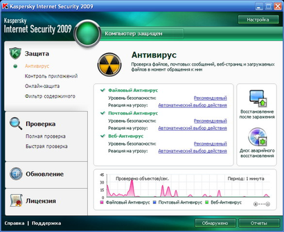 Понятно, что абсолютной защиты от вирусов не существует, и определенная вероятность заражения системы присутствует всегда. Так вот, для того, что бы проникший тем или иным способом в систему вирус не имел возможности вывести из строя сам антивирус, предусмотрена возможность самозащиты программы при помощи пароля. Кроме того, усовершенствованный механизм проактивной защиты от еще не известных вирусов обеспечивает, помимо выдачи традиционных предупреждений о каких-либо подозрительных действиях исследуемых объектов, еще и возможность отката всех действий приложения, которая позволяет свести к минимуму воздействие вредоносной программы на систему.