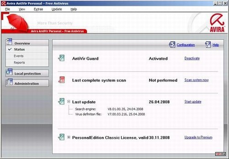 резидентную защиту от вирусов при загрузке файлов; просмотр и восстановление файлов, поврежденных макровирусами; защиту против любых (в том числе и заранее неизвестных) загрузочных и макровирусов; возможность работы по расписанию; автоматическое обновление программы и антивирусных баз через интернет (правда, не столь оперативное, как у других "конкурсантов"). Наряду с бесплатным Avira AntiVir Personal существует и несколько более "продвинутая" коммерческая версия Avira AntiVir Premium, способная, помимо всего вышеперечисленного, еще и защищать компьютер от spyware- и adware-программ, проверять почту на наличие вирусов, а также создавать "спасательные" CD-диски.
