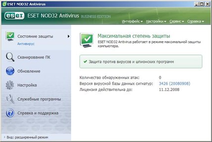 Главное окно антивируса ESET NOD32 вопросов ни у кого не вызовет: интерфейс прост и незамысловат, все на русском языке. Все команды выполнены в виде интуитивно понятных гиперссылок. Интерфейс предусматривает два режима: обычный и расширенный. В обычном режиме отображения малоподготовленный пользователь получает доступ лишь к основным, наиболее простым в использовании функциям администрирования системы защиты. Тогда как в расширенном режиме, который больше подходит для опытных пользователей, становится доступна настройка всех параметров защиты и служебных утилит.