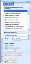 Настройка смены слайдов и эффектов анимации - Показ слайдов>Смена слайдов; Показ слайдов>Настройка анимации.