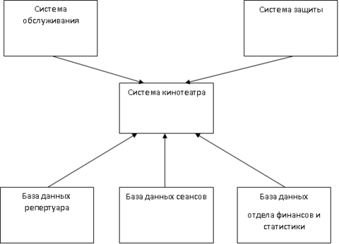 На схеме показано, что система продажи билетов в кинотеатре работает с базой данных репертуара, базой данных сеансов кинотеатра и базой данных отдела финансов и статистики. Также система продажи билетов в кинотеатре имеет систему защиты и систему обслуживания.