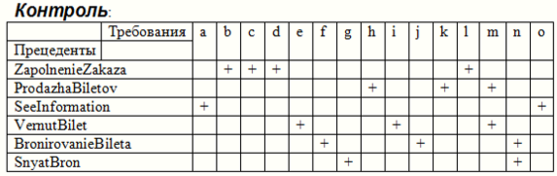 | BronirovanieBileta | f. Система должна позволять пользователю бронировать билет с целю последующего приобретения билета. j. Система не должна допускать ситуации, когда забронированные места не выкупаются. Бронирование должно обнуляться за 20 минут до начала сеанса. n. Система должна позволять кассиру контролировать бронирование и снятие брони с билетов | |