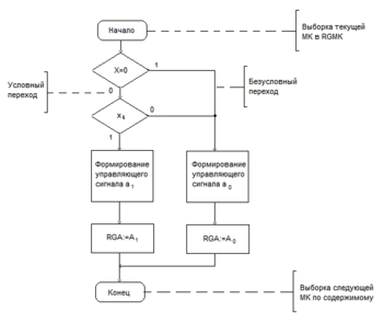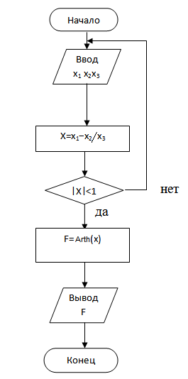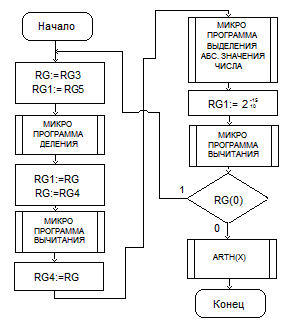 Теперь необходимо составить схему укрупненного алгоритма, используя уже полученную микропрограмму вычисления функции Arth(x). Предполагается, что переменные x1, x2 и x3 перед началом выполнения программы уже будут загружены соответственно в регистры RG4, RG3 и RG5. Данная схема алгоритма представлена на рисунке 4.8: