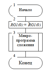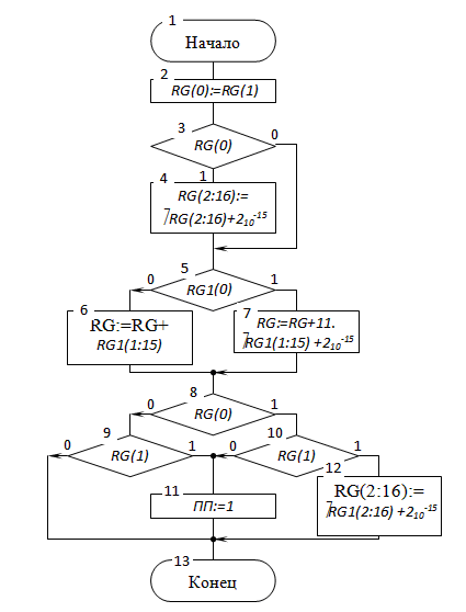 Числа представляются в 16-разрядном формате, старший (нулевой) разряд используется для представления знака числа, для операции сложения используется модифицированный дополнительный код, поэтому регистр RG имеет 17 разрядов (0:16) (поле RG(1:16) – для хранения первого слагаемого), регистр RG1 имеет 16 разрядов RG1(0:15) – для второго слагаемого, одноразрядному полю признака переполнения изначально присвоено нулевое значение, при операции сложения слагаемые помещаются по младшим разрядам, результат (сумма) помещается в поле RG(1:16), прибавление константы