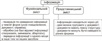 На рис. 1.1 подані дві сторони визначення поняття інформації: функціональна й представницька. Перша загалом визначає коло дій над інформацією, а друга – результат виконання цих дій.