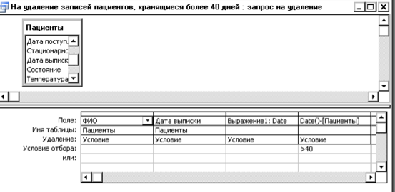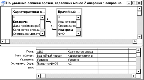 Запрос на удаление позволяет исключить из таблицы (или из связанных таблиц) записи, удовлетворяющие некоторому условию. В режиме конструктора такой запрос имеет вид: