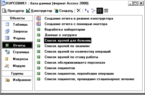 В данной работе использовалось два типа создания отчета: при помощи конструктора и при помощи мастера с последующим форматированием и редактированием в режиме конструктора. В некоторых отчетах был изменен цвет шрифта, заливка, применялось выравнивание, также использовалась панель элементов для создания надписей и полей, применялось поле с итоговыми вычислениями.