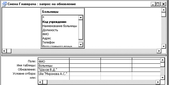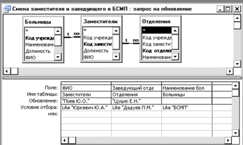 Запрос на обновление обеспечивает одну из важнейших сервисных функций системы управления базой данных – автоматизированную обработку данных. Такие запросы позволяют существенно сэкономить время оператора, выполняющего редактирование информации. В режиме конструктора такой запрос имеет вид: