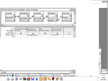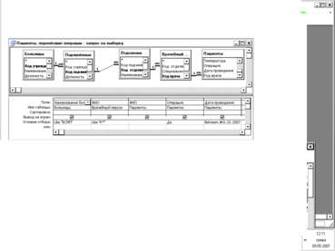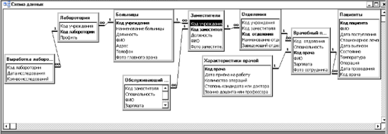MS Access 2002 создает реляционные БД. В этой БД пользователь может описывать отношения-связи между несколькими таблицами. Access учитывает эти связи во время обработки запросов, построения форм и отчетов. В данной БД необходимо связать созданные ранее таблицы, для чего необходимо вызвать команду горизонтального меню [Сервис] – [Схема данных]. Используя контекстное меню данного окна можно добавить необходимые таблицы. Выделив ключевое поле одной таблицы, нужно перетащить его на соответствующее поле другой таблицы, после чего в диалоговом окне можно установить соответствующую опцию – обеспечение целостности данных. В этом же диалоговом окне отображается тип создаваемой связи «один-к-одному» или «один-ко-многим». Уже готовая схема данных БД «Медицинские организации города» имеет следующий вид: