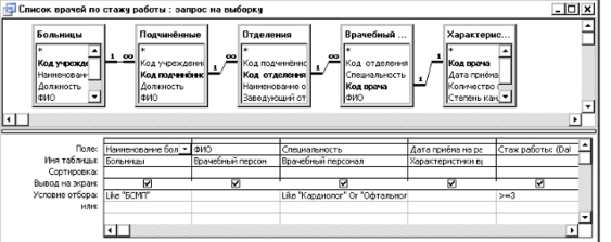 Получить перечень врачей указанного профиля, стаж работы которых не менее заданного для конкретного медицинского учреждения, либо для всех медицинских учреждения города.