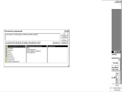 Над полями запросов можно выполнять вычисления. При этом создается новое вычисляемое поле. Для создания выражений используется окно Построитель выражений.