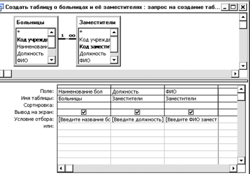 Данный запрос создаёт таблицу, содержащую следующие сведения: название больницы, должность заместителя, его Ф.И.О.