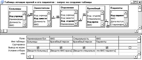 Создаёт таблицу со сведениями о названии больницы, Ф.И.О. врача и его специальность, Ф.И.О. пациента, у которого он является лечащим врачом.