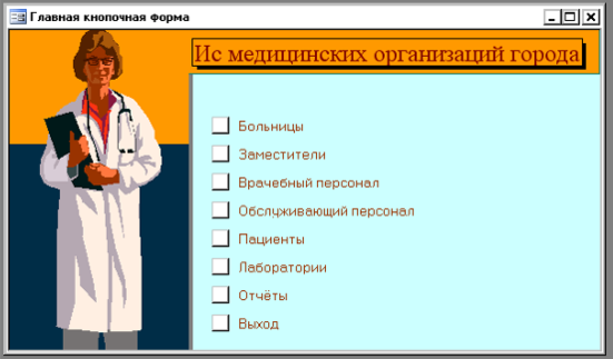 Таким образом, создав кнопочную форму для работы с созданными объектами БД (таблицы, формы, отчеты) и протестировав ее, был завершен процесс создания автоматизированной БД «Медицинские организации города».