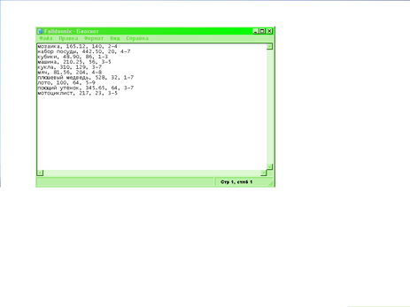 Файл содержит 10 записей с полями: наименование игрушки, цена, количество единиц товара и возрастные границы. Эти данные считываются, формируя соответствующие массивы, с которыми мы впоследствии работаем.