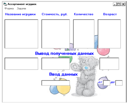 Для вывода на экран перечня игрушек и их характеристик, т. е. для начала работы приложения, необходимо выбрать Форма – Заполнение данными.