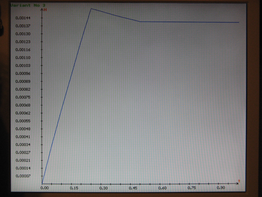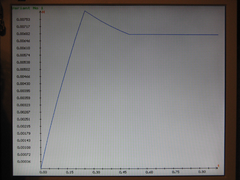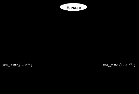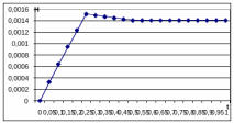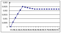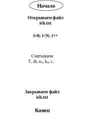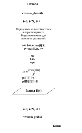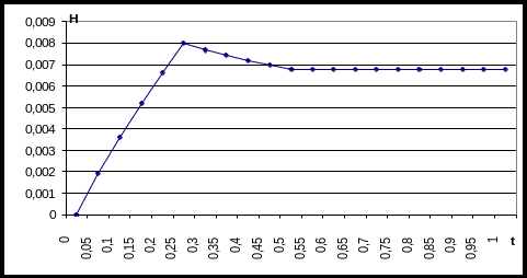 for(i=0;i { N_[i]=((int)(mas[i].T/mas[i].dt))+2; ptt[i]=(double*)malloc(N_[i]*sizeof(double)); pHH[i]=(double*)malloc(N_[i]*sizeof(double)); for(t=0,l=0;t<=mas[i].T+1e-5;t+=mas[i].dt,l++) { e=eee(mas[i].k0,mas[i].c,mas[i].e0,t,mas[i].T); v=vvv(mas[i].v0,mas[i].r,t,mas[i].T); H=e*v*sin(alfa)/pow(mas[i].R,2.0); ptt[i][l]=t; pHH[i][l]=H; fprintf(res,"H(%lf)=%lf\n",t,H); } N_[i]=l; fprintf(res,"\n"); } fclose(res); fflush(stdin); //vivodim grafiki for(i=0;i { vivod_grafikov(i,ptt[i],pHH[i],N_[i]); getchar(); } } //--------------------------------------------------------------------------- void chtenie_dannih(struct variant a[]) { int i; FILE*f = fopen("ish.txt","r"); for(i=0;i { fscanf(f,"%lf",&a[i].T); fscanf(f,"%lf",&a[i].dt); fscanf(f,"%lf",&a[i].e0); fscanf(f,"%lf",&a[i].k0); fscanf(f,"%lf",&a[i].c); fscanf(f,"%lf",&a[i].v0); fscanf(f,"%lf",&a[i].r); fscanf(f,"%lf",&a[i].R); } fclose(f); } //--------------------------------------------------------------------------- double eee(double k0,double c,double e0,double t,double T) { double k=kkk(k0,c,t,T); double res_e; if(t<=T/4) res_e=e0*(1-exp(-k*t)); else res_e=e0*(1-exp(-k*T/4)); return res_e; } //--------------------------------------------------------------------------- double kkk(double k0,double c,double t,double T) { double res_k; if(t<=T/8) res_k=k0*(1+exp(-c*t)); else res_k=k0*(1+exp(-c*T/8)); return res_k; } //--------------------------------------------------------------------------- double vvv(double v0,double r,double t,double T) { double res_v; if(t<=T/2) res_v=v0*(1+exp(-r*t)); else res_v=v0*(1+exp(-r*T/2)); return res_v; } //--------------------------------------------------------------------------- void vivod_grafikov(int a,double*ptt,double*pHH,int N_) { int gdriver = DETECT, gmode, errorcode; int xmax,ymax;//maksimalnie koordinatu x - shir, y - visota int xmin,ymin;//otstupi ot kraev int x_tek,y_tek;//tekushie koordinati int x_pred,y_pred;//predidushie koordinati int i; char st[20]; double minH,maxH;//krajnie znachenija H initgraph(&gdriver, &gmode, "f:\\turbocpp\\bgi"); //ystanavlivaem otstypi ot kraev xmin = 85; ymin = 15; //ystanavlivaem maksimalnie koordinati x i y xmax = getmaxx()-20; ymax = getmaxy()-20; //nahodim maksimalnoe i minimalnoe H maxH = minH = pHH[0]; for(i=0;i { minH = (pHH[i] maxH = (pHH[i]>maxH)?pHH[i]:maxH; } //zalivaem fon setfillstyle(SOLID_FILL,7); bar(0,0,getmaxx(),getmaxy()); //vivodim nomer varianta setcolor(2); sprintf(st,"Variant No %d",a+1); outtextxy(0,4,st); //4ertim osi setcolor(0); line(xmin,ymin,xmin,ymax);//os' oy line(xmin,ymax,xmax,ymax);//os' ox //risyem strelo4ki line(xmin,ymin,xmin+3,ymin+5); // Y \ line(xmin,ymin,xmin-3,ymin+5); // Y / line(xmax,ymax,xmax-5,ymax-3); // X \ line(xmax,ymax,xmax-5,ymax+3); // X / //podpisivaem osi setcolor(6); outtextxy(xmin+6,ymin,"H"); outtextxy(xmax,ymax-10,"t"); //4ertim i podpisivaem delenija po osi oy setcolor(0); settextstyle(SMALL_FONT,HORIZ_DIR,4); for(y_tek=ymax-20;y_tek>ymin+10;y_tek-= 20) { line(xmin-2,y_tek,xmin+2,y_tek); sprintf(st,"%0.5lf",maxH-(y_tek-ymin)*(maxH-minH)/(ymax-ymin)); outtextxy(xmin-70,y_tek-6,st); } //4ertim i podpisivaem delenija po osi ox for(i=0;i { x_tek=xmin+((ptt[i]-ptt[0])*(xmax-xmin)/(ptt[N_-1]-ptt[0])); line(x_tek,ymax-2,x_tek,ymax+2); if(i%3==0) { sprintf(st,"%0.2lf",ptt[0]+(x_tek-xmin)*(ptt[N_-1]-ptt[0])/(xmax-xmin)); outtextxy(x_tek-3,ymax+4,st); } } //risyem grafik setcolor(1); x_pred=xmin; y_pred=ymax; for(i=0;i { x_tek=xmin+((ptt[i]-ptt[0])*(xmax-xmin)/(ptt[N_-1]-ptt[0])); y_tek=(int)((pHH[i]-minH)*(ymax-ymin)/(maxH-minH)); y_tek=ymax-y_tek; line(x_pred,y_pred,x_tek,y_tek); x_pred=x_tek; y_pred=y_tek; } } Результаты в виде таблиц и графиков. 1-й вариант Исходные данные: T=1 c ∆t=0.05 c e0=1*10-9 к k0=0.01 с=0,1 v0=1000 м/с r=2 R=0,001 м Результаты программы: H(0.000000)=0.000000 H(0.050000)=0.001899 H(0.100000)=0.003616 H(0.150000)=0.005182 H(0.200000)=0.006627 H(0.250000)=0.007963 H(0.300000)=0.007677 H(0.350000)=0.007418 H(0.400000)=0.007184 H(0.450000)=0.006972 H(0.500000)=0.006780 H(0.550000)=0.006780 H(0.600000)=0.006780 H(0.650000)=0.006780 H(0.700000)=0.006780 H(0.750000)=0.006780 H(0.800000)=0.006780 H(0.850000)=0.006780 H(0.900000)=0.006780 H(0.950000)=0.006780 H(1.000000)=0.006780 Результаты в Excel: t k e v H 0 0,02 0 2000 0 0,05 0,019950125 0,0000000000010 1904,837 0,001899 0,1 0,019900498 0,0000000000020 1818,731 0,003616 0,15 0,019875778 0,0000000000030 1740,818 0,005182 0,2 0,019875778 0,0000000000040 1670,32 0,006627 0,25 0,019875778 0,0000000000050 1606,531 0,007963 0,3 0,019875778 0,0000000000050 1548,812 0,007677 0,35 0,019875778 0,0000000000050 1496,585 0,007418 0,4 0,019875778 0,0000000000050 1449,329 0,007184 0,45 0,019875778 0,0000000000050 1406,57 0,006972 0,5 0,019875778 0,0000000000050 1367,879 0,00678 0,55 0,019875778 0,0000000000050 1367,879 0,00678 0,6 0,019875778 0,0000000000050 1367,879 0,00678 0,65 0,019875778 0,0000000000050 1367,879 0,00678 0,7 0,019875778 0,0000000000050 1367,879 0,00678 0,75 0,019875778 0,0000000000050 1367,879 0,00678 0,8 0,019875778 0,0000000000050 1367,879 0,00678 0,85 0,019875778 0,0000000000050 1367,879 0,00678 0,9 0,019875778 0,0000000000050 1367,879 0,00678 0,95 0,019875778 0,0000000000050 1367,879 0,00678 1 0,019875778 0,0000000000050 1367,879 0,00678 2-й вариант Исходные данные: T=1 c ∆t=0.05 c e0=1*10-9 к k0=0.01 с=0,1 v0=1200 м/с r=1,5 R=0,002 м Результаты программы: H(0.000000)=0.000000 H(0.050000)=0.000577 H(0.100000)=0.001110 H(0.150000)=0.001606 H(0.200000)=0.002072 H(0.250000)=0.002509 H(0.300000)=0.002435 H(0.350000)=0.002367 H(0.400000)=0.002303 H(0.450000)=0.002244 H(0.500000)=0.002189 H(0.550000)=0.002189 H(0.600000)=0.002189 H(0.650000)=0.002189 H(0.700000)=0.002189 H(0.750000)=0.002189 H(0.800000)=0.002189 H(0.850000)=0.002189 H(0.900000)=0.002189 H(0.950000)=0.002189 H(1.000000)=0.002189 Резу