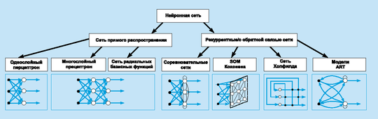 ИНС может рассматриваться как направленный граф со взвешенными связями, в котором искусственные нейроны являются узлами. По архитектуре связей ИНС могут быть сгруппированы в два класса (рис. 4): сети прямого распространения, в которых графы не имеют петель, и рекуррентные сети, или сети с обратными связями.