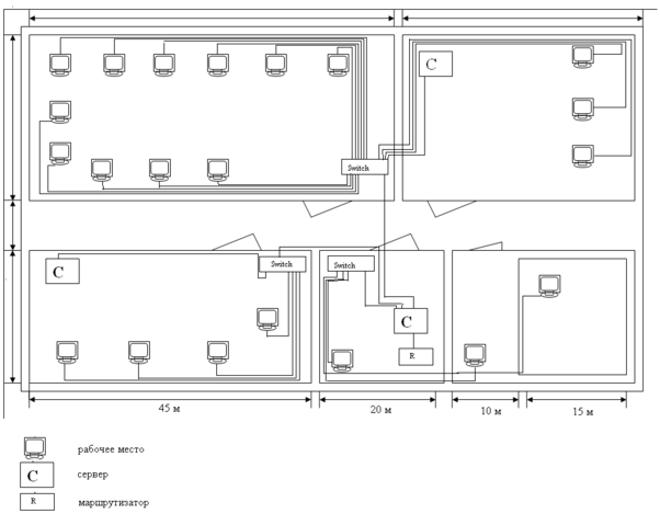 Разводка кабелей осуществляется напрямую от коммутаторов к сетевым адаптерам каждого из рабочих местах сотрудников турфирмы с помощью коммутационных шнуров. Соединение серверов с коммутатором также осуществляется коммутационными шнурами напрямую.