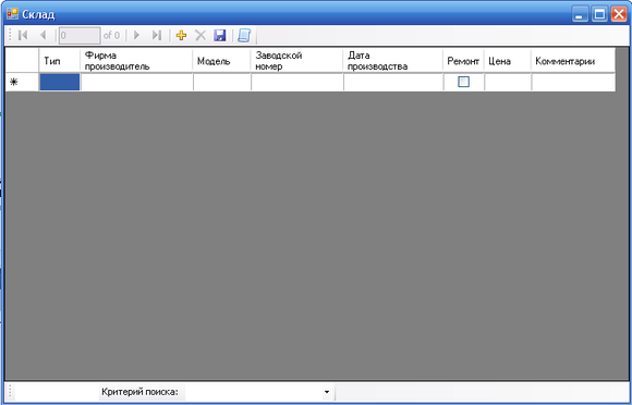 В даному програмному продукті база має таку структуру: тип побутової техніки, фірма виробник, модель, заводський номер, дата виготовлення, ремонт, ціна, коментарі. В цій програмі реалізовано додавання елементу в список; видалення із списку елемента; пошук елементів за ціновим проміжком, проміжком виготовлення; зміна даних елементу списку; збереження в базу даних.