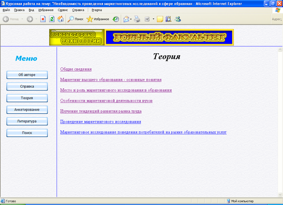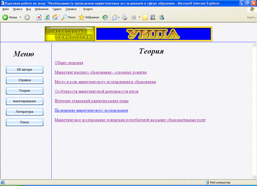 После запуска информационного сайта будет запущена программа браузер (Internet Explorer, Opera, Netscape), которая будет отображать содержание веб-страниц. После открытия программой браузером страницы Index.htm в окне браузера вы увидите страницу «Теория» смотрите рис. 7.