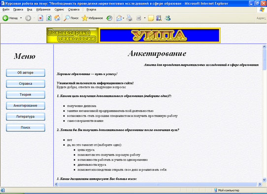 При нажатии на кнопку «Анкетирование» перед пользователем будет открыта страница с анкетой.