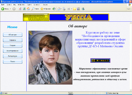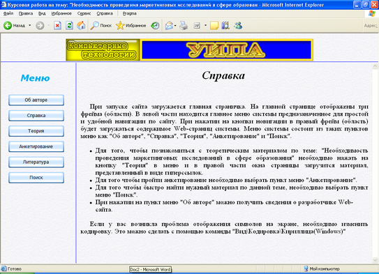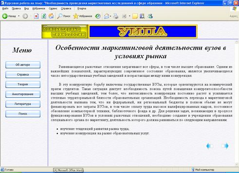 Реализация сайта была произведена без помощи каких-либо мощных средств программирования. Все страницы созданы при помощи обычного блокнота, текстового редактора MS Word, Microsoft Office, графического редактора Photoshop. Этот фактор позволяет отметить, что сайт выполнен в лучшем сочетании: минимальный размер / полнота излагаемого материала. Так как сайт предназначен в первую очередь для обучения, то можно сказать, что скорость загрузки имеет не маловажную роль. Далее представлена страничка, посвященная проекту (рис. 11) и код в формате HTML.