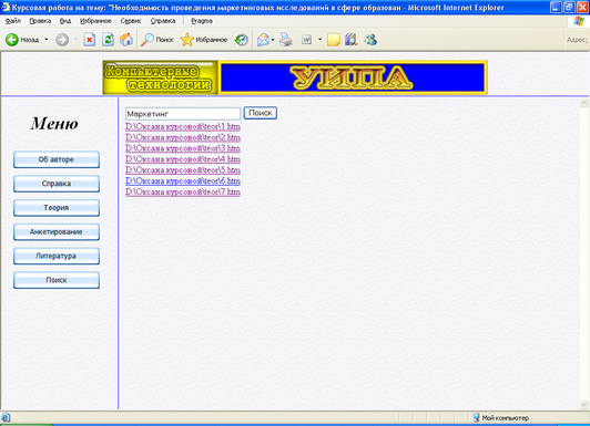 На странице поиск можно осуществить поиск по ключевым словам или фразам (смотри рис. 10). Если слово найдено, ниже текстового поля будет список файлов, в которых найдено поисковое слово или фраза. Элементы списка являются гиперссылками, то есть по щелчку на ссылке, будет открыта страница на которой найдено поисковое слово или фраза.