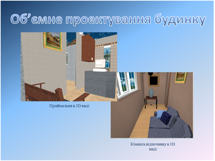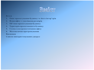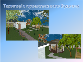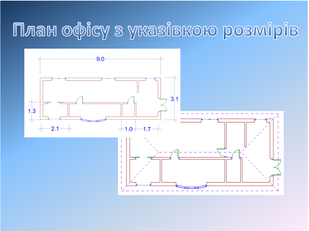 У графічному моделюванні був змодельований офіс, ведучий свій бізнес у сфері одягу. План офісу розроблявся, виходячи з кількості співробітників і заданого встаткування (2 комп'ютери, 2 принтери, 1 сканер, 2 блоку безперебійного живлення). На плані показані меблі, комп'ютери, електротехнічні арматури (світильники, вимикачі, розетки), вікна й двері. Розроблений дизайн офісу (килимове покриття, кольори стін, форми вікон і т.д.). На території крім офісу, розміщені газони, доріжки, під'їзд для автомобіля. Розташувати ємність для поливу газону на плані території офісу. Був зроблено альтернативний вибір комп'ютерного забезпечення. План офісу займає 21,5 м².