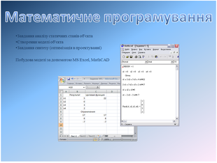 У математичному моделюванні були вирішені всі задані завдання за допомогою Excel, MathCAD. Всі отримані результати вирішені двома програмами сходяться значити отримані розрахунки були зроблені правильно. Порівнюючи методи рішення можна сказати, що програма MathCAD зручна своєю простотою й швидкістю у відмінності від Excel, що у свою чергу дозволяє зрозуміти процес рішення задачі.