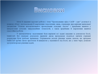 Висновок: Отримані в результаті обчислень різними програмними продуктами (Excel, MathCAD) значення повністю ідентичності, що говорить про вірогідність правильного рішення.