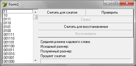 При нажатии Button5 “Восстановить" происходит побайтового считывание файла. Алгоритм разжатия состоит из двух этапов. На первом этапе происходит считывание файла блоками размером в 1 байт. Производится запись считанных байтов в специальную переменную. Когда длина переменной составляет 16 символов или более, начинается анализ считанной информации. Производится проверка на соответствие кодовым словам и последующая запись полученных значений в новый файл. На втором этапе производится проверка на остаток и удаление лишних данных (случай, когда было выполнено дополнение нулями при сжатии).