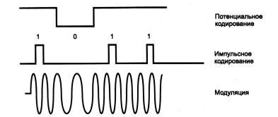 Потенциальное или импульсное кодирование применяется на каналах высокого качества, а модуляция на основе синусоидальных сигналов предпочтительнее в том случае, когда канал вносит сильные искажения в передаваемые сигналы. Обычно модуляция используется в глобальных сетях при передаче данных через аналоговые телефонные каналы связи, которые были разработаны для передачи голоса в аналоговой форме и поэтому плохо подходят для непосредственной передачи импульсов.