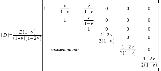 Так как такое умножение никогда не выполняется в явном виде, запишем здесь матрицу [D] только для изотропного материала, хотя это нетрудно сделать и для случая произвольной анизотропии. При использовании обычных упругих постоянных: модуля упругости Е и коэффициента Пуассона v - матрица имеет вид